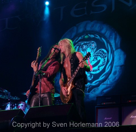 At least it seemed to be the end of the show. Leon, who before acted like a true fun-loving rocker walked right up the catwalk, a water bottle in his hand, grinning like a child and emptying the bottle over him. He asked the crowd if they want more. Go figure. So he goes back and picks up another bottle of water. Same procedure. Did they want more? He goes back, again, coming back with a huge glas (1 litre) of beer, and placed it on his head. Bottom up, of course. It was really funny to see how the glass slowly emptied. Leon, soaking wet, then led the band to the final headbanger Power Of The Rock (We Have Ways To Make You Rock, 1986).