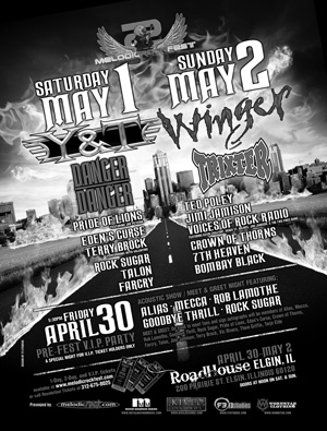 ![]() MelodicRockFest 2 just got a little bit bigger with the addition of an additional opening act for the Sunday show. St Louis based metal band Strikeforce are joining the show to shake the walls from note 1 Sunday. Founder and lead guitarist of Strikeforce, Duke states: "We are very proud to be part of MelodicRockFest 2. We can't wait to hit Chicago and rock our fans. We want to thank Andrew and melodicrock.com for including us in this killer festival, with all these great artists." Strikeforce has toured with Dokken, Joan Jett, 38. Special, Accept, Warrant, Winger, Blue Oyster Cult, Survivor and many others! The band's 2006 release on Retrospect Records is being re-released worldwide on March 23, 2010 by Sweet Sounds/Island Def Jam Music Group. Strikeforce is: Duke Jackson - lead guitar; Joe Council - bass; Jim Burdette - drums; Travis Wyant - lead vocals. ![]() In further MelodicRockFest news, I can confirm that due to another event cancellation, Ted Poley of Danger Danger has confirmed his availability to hang out with fans at the Friday April 30 VIP Concert (featuring sets by Alias, Mecca, Rob Lamothe, Rock Sugar and Goodbye Thrill) . He will hopefully be joined by the other D2 guys as well as Jim Peterik, Crown Of Thorns, Alias, Rob Lamothe, Mecca, Vic Rivera, Eden's Curse, Terry Brock, Talon, Farcry, Terje Eide (On The Rise), Goodbye Thrill, Eric Ragno, Thom Griffin, Gary Brandon (White Sister) and more. VIP tickets are still available and can be purchased via PayPal at: www.melodicrockfest.com or by calling 312-675-8025. ![]() And finally - to those that asked about handing out Event Flyers - here they are - in full Color and B&W. The advert will appear in the Illinois Entertainer from March 30. But if anyone knows a relevant store/outlet that would carry some flyers or post on their door/window, grab either of these and go for it! Right click and "save as" to get full size flyer. Click on graphics to view in full size! Thanks to Stephen Jensen at www.F3Studios.com for the awesome artwork. BOMBAY BLACK IS BACK AND READY TO SHOW SOME LOVE!: Here's some more MRF2 relevant info - from ass-kickers Bombay Black - and their news of their upcoming studio album Love You To Death, due April 10 on Kivel Records. And a free download of a brand new track from the album (a big groove rocker that sounds exactly as we have come to expect from these guys)... Press Release / "We couldn't be happier to kick off the spring with one of our fave Kivel acts. The Arkansas Quartet is back with their latest effort, Love You To Death. Bombay Black has been a band that has grown with each release. Rather then stay stagnant and safe, they have always looked to create something new and fresh. The same way Motley Crue evolved from Shout at The Devil and Theater Of Pain, to Dr Feelgood. Love You To Death is the bands next step in their evolution. With a combination of the new Shine down meets the bombastic sound of Motley Crue, Bombay Black delivers a hard hitting album that is fresh with what is hot today. While still keeping one foot in the hard/melodic rock genre and delivery sing along fist pumping music. This album promises not to disappoint. Love You To Death is will be released April 10th, and you can pre-order your copy from today at www.kivelrecords.com. The band will be performing some of the new material as well as songs from their previous releases at MelodicRockFest 2 May 2nd." One song in particular you can hear right here - Download: Demons Down ![]() Other Upcoming Kivel releases: Goodbye Thrill Keepsakes (CD/DVD) April 6th (After a DVD mastering issue delay this will be released) Bombay Black Love You To Death April 10th Planet Zero TBA May 15th Goodbye Thrill Outrageous NEW Studio Album! May 1st Seven Dayz TBA Early June Release Farcry Optimism Late June Release Talon Rejuvenation Early Sept Release "Look for more releases come the fall from Tango Down, Jace Pawlak and a few other surprises. Also, we will be giving out a FREE sampler CD to people in attendance to Andrew's party this May in Elgin Illinois. This sampler will have songs from ALL the above mentioned bands. Its going to be a fun weekend.....do not miss out!!" LATEST FRONTIERS RECORDS PROMO SPOT: TOMMY HEART TO FEATURE ON LYRAKA PROJECT: Lyraka has recently signed on the renowned German vocalist, Tommy Heart (Uli Jon Roth, Fair Warning, Soul Doctor) for session work. As reported earlier, Lyraka is a heavy metal opera project that encompasses a set of highlights CDs, as well as a 3-D animated movie. Graham Bonnet (Rainbow, MSG, Alcatrazz) has completed 4 songs for the project, contributing the voices of the musical narrator and Palace Guard. The composer and lead guitarist of the project, Andy DiGelsomina, states: "The acquisition of Tommy Heart has been a major coup for the Lyraka saga. Tommy adds a completely unique voice to go with the character written for him." The first volume of the CD set, Lyraka Volume 1 is set for release in February 2011. ![]() |