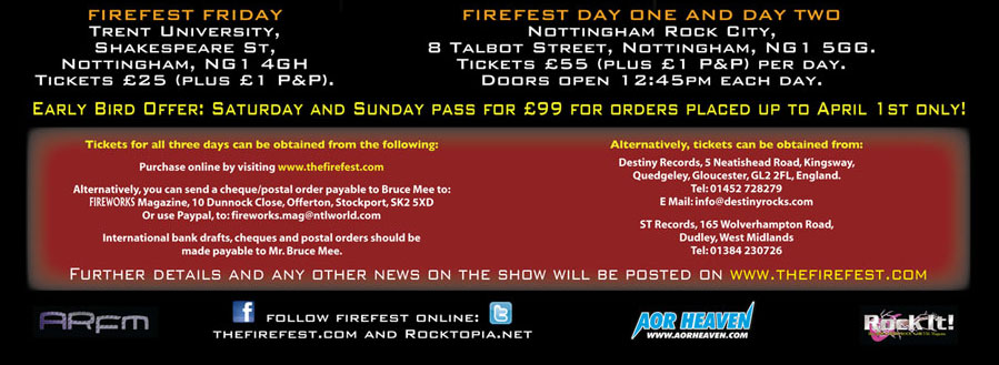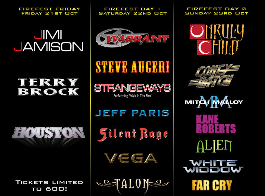 Firefest and Fireworks Magazine are pleased to announce that we've decided to repeat the same format as last years show. It will take place on October 21st, 22nd & 23rd, with three bands playing on the Friday night and seven bands each on the Saturday and Sunday. Yet again we think we've managed to put together an event with a great deal of variety which has strength right through the line-up, with many unexpected artists pledging to make their long-awaited return to live action or making their first ever visits to the UK. We're also pleased to announce that we now have the full support of a new sponsor: Classic Rock's offshoot magazine Classic Rock Presents: AOR. The great new magazine will be helping us to promote the festival. Many thanks to Geoff Barton, Chris Ingham, Dave Ling and all the staff at Future Publishing for their very welcome support. Venue and dates Firefest will take place on Friday 21st October 2011 at the Trent University Students Union building in Nottingham, and on Saturday and Sunday 22nd & 23rd October 2011 at our regular venue of Rock City in Nottingham. Line-up Friday 21st October (Top to bottom) JIMI JAMISON Even though we try to vary the line-up from one year to the next, it's become a kind of tradition to ask back immediately any artist who makes a huge impression, and last year the general consensus was that the former Survivor singer Jimi Jamison made the biggest impression of all. With a band that will hopefully be the same as last year (availability permitting), Jimi and guitarist Tommy Denander will be playing more classics from the Survivor and Jimi Jamison back catalogue. TERRY BROCK After his amazing performance last year with Strangeways we have great pleasure in welcoming Terry Brock back as a solo artist. With a backing band consisting of our good friends Adam Holland (guitar), Gerard Zappa (bass), Mike Morales (drums) and Craig Pullman (keys) from Valentine, Terry will be playing a set plucked from his solo career that will no doubt include a hefty slice of last year's well-received 'Diamond Blue' album. Terry will be making his first solo appearance in the UK since 2001. HOUSTON With their debut album picking up many outstanding reviews from around the globe it should come as no surprise to see young Swedish duo Houston on the bill. Proving that classic AOR can be written and played just as well by youngsters as established older artists, Hampus 'Hank' Erix and Freddie Allen will be bringing their touring band to kick off the party. Saturday 22nd October (Top to bottom) WARRANT One of the most popular artists of the late 80s MTV boom, the US band have sold 10 million copies worldwide of their classic albums, including 'Dirty Rotten Stinking Filthy Rich', 'Cherry Pie' and 'Dog Eat Dog'. With original members Joey Allen (guitars), Jerry Dixon (bass), Steven Sweet (drums) and Erik Turner (guitars), along with ex-Lynch Mob singer Robert Mason who's been fronting the band since 2008, they'll be making their first appearance on UK soil since their support slot to Dave Lee Roth in the early 90s. STEVE AUGERI The ex-Journey singer makes a welcome return to Firefest as a solo artist. Steve Augeri will have his established backing band of Adam Holland, Gerard Zappa, Mike Morales and Craig Pullman (all ex-Valentine) and will be playing plenty of Journey favourites along with a handful of songs from his soon to be released solo album. He's sure to be a guaranteed crowd pleaser. STRANGEWAYS Another band who played last year, this time out the popular UK/US alliance Strangeways will be playing the whole of their 'Walk In The Fire' album along with other songs from 'Native Sons' that they didn't play last time. Terry Brock, Ian Stewart, Jim Drummond and the guys enjoyed their time on stage so much last year that they can't wait to come back and do it again. JEFF PARIS The popular US singer/songwriter is making his first visit back to the UK as a solo artist since he played at the first Gods festival in 1993. He has a new album in the works with guitarist Tommy Denander, and Tommy will be assembling a top notch band to play a cross section of his impressive back catalogue. Also, with his first two mid-80s classic AOR albums ('Race To Paradise' and 'Wired Up') due for re-issue this year, what better time is there for him to make a welcome return? SILENT RAGE We're delighted to announce that LA melodic hard rock band Silent Rage will be joining us for their first UK show in many years. Jesse Damon (guitars/vocals), Mark Hawkins (guitars/vocals), E.J. Curse (bass/vocals) and Rodney Pino (drums) will be cherry picking the best songs from their four album career, and as many of the Firefest crew have seen them before we can guarantee that they'll be one of the best and most professional bands of the weekend. VEGA Currently causing a stir with their amazing debut album 'Kiss Of Life', Vega were a no brainer for this years festival. Consisting of ex-Kick/Eden vocalist Nick Workman, drummer Dan Chantry and songwriting brothers James and Tom Martin (who've written songs for recent albums by House Of Lords, Khymera, From The Inside, First Signal & Issa), Vega will bring their catchy modern slant on traditional AOR to our main stage. TALON US band Talon should be no strangers to anyone who's attended Firefest and Gods festivals over the years. The classy hard rock band will again grace our main stage, this time fronted by new singer Shawn Pelata (Line Of Fire), who joins Jim Kee (guitar), Phil Keller (bass), Kory Voxen (guitar) and John Parker (drums) to get things under way in Rock City. Sunday 23rd October (Top to bottom) UNRULY CHILD It is with great pleasure that we can announce Unruly Child as our headliners on the Sunday night. The classic US band featuring Bruce Gowdy (guitars), Guy Allison (keys), Larry Antonino (bass), Jay Schellen (drums) and legendary vocalist Marcie Free, will be playing an ultra-rare show and certainly their first outside of the US. With a se