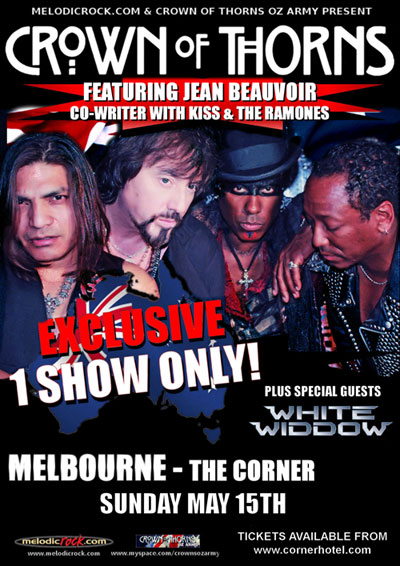 VETERAN HARD ROCKERS KING KOBRA ARE BACK WITH A VENOMOUS NEW ALBUM: Frontiers Records is excited to announce the release of the Self-Titled come back album from King Kobra on April 15 in Europe and May 5 in North America. Formed in 1984 by legendary drummer Carmine Appice (Vanilla Fudge, Rod Stewart, Ozzy Osbourne), Los Angeles heavy metal outfit King Kobra recorded two critically acclaimed albums for Capitol Records – the 1985 release 'Ready to Strike' and 1986's 'Thrill of a Lifetime'. Along with Carmine, the band featured four relatively unknown musicians at the time – David Michael-Philips and Mick Sweda on guitar, Johnny Rod on bass and Mark Free on lead vocals. King Kobra toured the U.S., Canada, Europe and Mexico playing shows with Kiss, Iron Maiden, Quiet Riot, Ted Nugent, Queensryche and Autograph. The band was featured regularly on MTV and performed the theme song for the #1 1986 motion picture "Iron Eagle". After disbanding in 1988, each member continued his career in other successful major-label groups - Carmine to Blue Murder (Geffen), Mark Free to Unruly Child (Interscope), Mick Sweda to the BulletBoys (Warner Bros.), Johnny Rod to W.A.S.P. (Capitol/EMI) and David Michael-Philips to Lizzy Borden (Metal Blade). The year 2010 saw the band reunite the original classic '85 lineup, replacing original singer Mark Free (now Marcie Free) with veteran lead vocalist Paul Shortino (Rough Cutt, Quiet Riot). "This album captures all the great points we had in the 80's, but better" says Carmine Appice "The music is more traditional King Kobra music. Great lyrics, kick ass songs with cool hooks and really good playing. A really great hard rock/metal record with lots of energy". David Michael-Phillips adds "It truly is an all-star album. Paul Shortino is amazing! I can honestly say he is one of the best vocalists in the business along with being one of the nicest and most generous people I have ever met". The band is planning to get on some targeted American and European summer festivals this year. Watch out: King Kobra is smokin' hot, back stronger than ever and "Ready to Strike" once again! The new album "King Kobra" will include the following tracks: Rock This House, Turn Up The Good (Times), Live Forever, Tear Down The Walls, This Is How We Roll, Midnight Woman, We Got A Fever, Tope Of The World, You Make It Easy, Cryin' Turns To Rain, Screamin' For More, Fade Away. WebLinks: www.frontiers.it / www.myspace.com/frontiersrecords / www.myspace.com/officialkingkobra. xx![]() CROWN OF THORNS - AUSSIE SHOW - TICKETS ON SALE NOW: For the first time in Australia, MelodicRock.com, Vagabond Entertainment and Crown of Thorns Oz Army presents Crown of Thorns LIVE! Sunday May 15 at Melbourne's The Corner Hotel. TICKETS ON SALE NOW VIA - www.cornerhotel.com. AUSSIE MELODIC ROCK FANS - PLEASE SUPPORT THIS SHOW IF YOU WANT TO SEE MORE LIKE IT. Fronted by Jean Beauvoir, co-writer for Kiss, The Ramones, and countless other bands and musicians, Crown of Thorns are about real Joining Crown of Thorns as a special guest will be Australian melodic rock sensations White Widdow, who have released their debut album through AOR Heaven in Europe. Crown Of Thorns: Sunday May 15, The Corner Hotel Pre-sale Ticket Price: $45 (+$3 booking fee) Door on the night: $50 (if available) Doors open: 8.00 Tickets On Sale: Mon 14 Feb ![]() MAGNUM BONUS TRACK ONLINE - SIGNING SESSION IN GERMANY: After the fantastic chart entries in Europe (Germany #19, Sweden #46, UK #55, Switzerland #56) of the latest studio album The Visitation Magnum are about to release the bonus track of the limited Digipack edition online: "Eyes Like Fire" Online: www.youtube.com/watch?v=FvNeyFITpJ4. The band will do a signing session in Germany: Where: Saturn, Würzburger Str. 6, 90762 Fürth, Germany, fon.: +49-911 97595-0 Day: March 16th, 2011 Time: 05.30 pm - 06.30 pm CET Full European tour dates at: www.magnumonline.co.uk / www.spv.de. THUNDER BACK FOR A ONE-OFF UK SHOW: News from Thunder HQ in the UK: "Yes people, it's true. I've been informed today that the ex members of Thunder have agreed to reunite after almost 2 years apart, for a one off show at High Voltage Festival, at Victoria Park London on Sunday July 24th. I've been asked to point out that this does not mean they're getting back together, and there are no plans to record or release any new material. In fact Luke and Chris have asked me to stress that whilst they're both chuffed to be doing a Thunder show, their commitment to The Union and the new album release (later this year) is undiminished, and the writing is going really well. All ex-Thunder band members' other activities will remain unchanged, and Harry is about to go on tour with Magnum, so this really is a one off. Danny says: "I can't lie, I've missed singing and being in the band more than I thought I would over the past couple of years, so when High Voltage called last week, I was keen to explore it, as it was great last year. We're still releasing the new "Rough & Ready" live album, but there's no plan to do any other recording going forwards. It will be great to play again, and we're really excited". Luke says: "I thoroughly enjoyed playing at the inaugural High Voltage last year with The Union so I'm really looking forward to getting together with the rest of the boys for a one-off reunion (no pun intended). Fortunately it fitted in nicely with everything else we're doing so in the end it was difficult to say no. I'm sure we'll have a lot of fun". Ben says: "We're all busy with other things, so it took a bit of discussion to ensure there were no clashes, but we got it sorted. I only live down the road, and I can't think of a better way to spend a sunny Sunday evening, so happy days!" This is great news, I will of course be there, as I hope will you, but there is no more information, so please don't bombard me for info on a new studio album, tour etc. Full festival and line up details can be found at: www.highvoltagefest