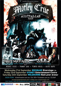 DAVID COVERDALE DUE ON ROCKLINE: David Coverdale will be the featured guest on the US nationally syndicated radio show Rockline with host Bob Coburn on Wednesday March 9, 2011 at 8:30pm PT / 11:30pm ET as part of our ongoing series "Notes on Music" featuring career long Greatest Hits as presented by David and then again on Wednesday March, 30 at 8:30pm PT / 11:30pmET for the new Whitesnake album, "Forevermore". For a station near you and for information regarding how to log onto the Internet for the broadcast go to www.RocklineRadio.com Each show will be streamed on the Rockline website for two weeks beginning the afternoon after their broadcast. DEF LEPPARD RECORD NEW SONGS FOR 'MIRRORBALL' LIVE ALBUM IN JUNE: From Billboard.com: "Def Leppard will offer an early taste of its next studio album with three new songs that will be part of a live album, "Mirrorball," which is due out this summer. The group is also planning to release a retrospective book, "Def Leppard, The Definitive Visual History," featuring more than 30 years of photographs by Ross Halfin, in June. "When we decided to do (the live album), it just got said -- I don't know by who -- 'Why don't we chuck a couple of new songs on the end?'" frontman Joe Elliott tells Billboard.com. "And that two became three, and in fairness it could've been four if we'd just had a little bit more time. But we wanted to tour this summer, so any fourth or fifth song we had brewing, we'll save them for the next record." Elliott composed "Undefeated," which he describes as "a very Queen-type vocal thing. It even features piano and stuff." Guitarist Phil Collen's "All About Believin' " is "a pop-rock song," while bassist Rick Savage's "Kings of the World" is "a big, epic, rock anthem that will sound great in arenas and stadiums all over the world -- kind of 'We Will Rock You' with guitars, if you like." "They're all very different to each other," Elliott adds. "They don't sound specifically like any previous Def Leppard songs, but they sound like Def Leppard songs. They have to have our identity on them, otherwise they might as well be Tom Waits or R.E.M. We have a signature sound that we're not scared of anymore." Elliott says the group will continue to assemble new songs while on the road this summer, working on them backstage in much the same way it made 2008's "Songs From the Sparkle Lounge," which debuted at No. 5 on the Billboard 200. "If we can pull together the other seven or eight songs we'd like to do," Elliott says, "we'd start recording them when the tour's over and hopefully have them ready for summer of 2012...or if not, then out in the autumn for the Christmas market." The live tracks on "Mirrorball," meanwhile, were recorded during 2008 and 2009. Elliott says Def Leppard records and rates each show and selected the performances -- which will include "Pour Some Sugar on Me," "Rock of Ages," "Foolin'," "Hysteria," "Photograph" and "Bringing on the Heartache" -- from the very best concerts. "I think one of the reasons a lot of artists used to -- how can I say this -- cheat and clean up their live recordings was because they only recorded the one night," Elliott explains. "Somebody makes the odd mistake and they don't want it going out forever, so they go in and clean it up. We didn't have to do that because we just chose the versions that had no mistakes on them. A very nice luxury. Thank you, technology." "Mirrorball" marks the first official live album in Def Leppard's discography. The group has released a selection of live B-sides over the years and has included live recordings on deluxe editions of its albums, including an edited 1983 show from the Los Angeles Forum for the 2009 "Pyromania" reissue. For the photo book, Halfin and the band tapped a Japanese "uber fan" to sift through some 30,000 images which were ultimately knocked down to 450 dating back to 1979. Elliot says it was an emotional experience. "It was an interesting journey that we've taken together," he notes. "You see pictures of (the late founding guitarist) Steve Clarke and you get a wry smile on your face. It's just a journey. A lot of it was with anger, a lot of it was with humor, a lot of it was with regrets, a lot of it was with honor -- every single emotion you can have over a 30-year period of being in the trenches with these guys." Def Leppard plans to play "Mirrorball's" new songs when it hits the road starting June 7 in Belfast, Ireland. The group will play the Download Festival on June 10 in the U.K., then begins a North American run through the summer that will include a series of dates with Heart, who Elliott says "I'm going to want to stand at the side of the set and watch them play every night." Elliott, meanwhile, will also be touring with his Mott the Hoople-celebrating side band the Down 'N' Outz, which will be opening 10 U.K. shows for Paul Rodgers in April. The group is also "about halfway through" recording a second album, Elliott says, and will be releasing a live DVD with some bonus video material this spring. MOTLEY CRUE/POISON/NYD US TOUR DATES: From Billboard.com: "Motley Crue is teaming with fellow Los Angeles rockers Poison and early influences the New York Dolls for a summer tour to commemorate the 30th anniversary of the band's first album. But it's not being considered a third version of the Crue Fest series. "It's definitely not Crue Fest," drummer Tommy Lee tells Billboard.com. "Crue Fest is, like, five [bands], and this is just the three of us. But it's special because it's another Crue tour and it's summertime, man. That's always special." Lee says the band is "just starting" to talk about it stage production for the jaunt, which begins June 7 in Dallas and so far has 38 dates booked through Aug. 5 in Toma, Wisc. Repertoire decisions, including how to treat the anniversary of 1981's platinum "Too Fast For Love," will be made in April when Lee, Nikki Sixx, Mick Mars and Vince Neil -- recently released from jail in Nevada after servi