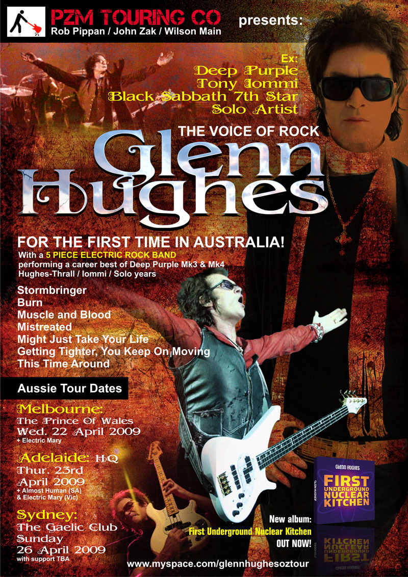 STREET LEGAL READY TO BITE THE BULLET: Frontiers Records is particularly pleased to announce the come back release from Street Legal Bite The Bullet due for release in Europe on March 13. Street Legal name came to prominence for the first time during the year 2000 when the band's debut "Thunderdome" was released with strong critical acclaim in Europe on Frontiers Records. The band did already build a a solid reputation with some great live shows in their home country Norway, particularly their first show in May 99 as support of W.A.S.P. gathered such comments as: - "Iron Maiden threatened Kiss in 1980, Clawfinger showed muscle before Anthrax in 1990, Skunk Anansie blew away Therapy? in 1995. In 1999 Street Legal outplayed W.A.S.P.» - Stig Myhre (Nettpuls). "Street Legal should be the next Norwegian act to make a remarkable impact on an international level" - Jan Dahle (Scream). After the release of "Thuderdome", Street Legal performed some killer shows at the Sweden Rock Festival and at the Gods Festival in the UK. Soundwise, these Norwegian rockers have been often compared to Thin Lizzy, Whitesnake and Blue Murder. "Classic rock with a strong blues foundation, still very harmony driven", comments bass player and singer Bjorn Boge, when asked to describe the sound of the band to the uninitiated. "A lot of influences from the past: Westcoast Music, Metal, Hard Rock from the late 70´s. Always with focus on the song. Lyrics are also important. Chuck Frazier, my buddy in the lyric department is the major force behind this". After a long hiatus and some line-up changes, Street Legal are now back to Rock with a superb new album that takes from where the previous has left. Bjorn explains: "This record marks the introduction of my brother Oystein as the drummer in the band and also brings a more straightforward rock'n roll approach than "Thunderdome". For the time being we decided to stick with just the two of us. We know a lot of great guitar players, so the live lineup will be as strong as ever". With Bjorn and his brother Oysten on drums, featured on the album there are Tore Ostby (ex Ark, Conception) and Rolf Bjorseth playing guitars. Bjorn concludes: "It's been a long and bumpy ride the last nine years for Street Legal. Since Thunderdome we went through heaven and hell: tour bus accident, personal disasters, depressions, divorces… The only problem we didn't have was drugs! "Bite the bullet" was so hard to make, that we sometimes felt it was better to quit and call it a day. But we didn't. And today I am very proud of what came out of this process. Street Legal will kick serious ass again. Looking forward to see you on the road!" Final track listing of Bite the Bullet includes: Loading Up; Somebody Up There Likes Me; Unconditional Love; Warriors of Gengis Khan; Shadow In My Heart; Bite The Bullet; Starship Trooper; Trapped; The Battle of Kringen; Maniac; Silent Tear. Weblinks: www.myspace.com/streetlegalnorway / www.frontiers.it / www.myspace.com/frontiersrecords. xx![]() MR. BIG JAPANESE TOUR DATES: Mr. Big Japanese tour dates for June 2009 have been announced. They are: 6 / 5 Zepp Sapporo 6 / 7 Zepp Sendai 6 / 9 Kouseinenkin Hall Ishikawa 6 / 10 Zepp Nagoya 6 / 12 Zepp Hukuoka 6 / 15 Grand Cube Osaka 6 / 17 Hiroshima ALSOK Hall 6 / 18 Osaka Kouseinenkin Hall 6 / 20 Budokan The band appears on the cover of the new Burrn Magazine, out today in Japan. ![]() GLENN HUGHES RETURNING DOWNUNDER - WITH FULL BAND: PZM Touring Company (Australia) Rob Pippan/John Zak /Wilson MainPresents 'The Voice Of Rock' Glenn Hughes, performing for the first time in Australia with 5 piece electric rock band a career best of; Deep Purple MKIII and IV, Hughes-Thrall, Iommi-Hughes and solo years. Glenn and band will perform hits such as Burn, Stormbringer, Muscle and Blood, Love Communion, Might Just Take Your Life, Gettin' Tighter, Soul Mover, and much more. Appearing at: Melbourne: The Prince of Wales Wednesday 22nd April 2009 with support Electric Mary (Vic) Tickets From The Prince of Wales Adelaide: HQ (formerly Heaven cnr Nth Terrace / West Terrace Adelaide) Thursday 23rd April 2009 with support Almost Human (SA) and Electric Mary (Vic) Tickets From Venuetix Sydney: The Gaelic Club Sunday 26th April with support TBA Tickets From Moshtix All ticket agency details TBA. WebLinks: www.myspace.com/glennhughesoztour / www.glennhughes.com / www.myspace.com/glennhughesonline. Click on graphic for full size tour poster. BASS LEGEND BILLY SHEEHAN TO RELEASE HOLY COW: HOLLYWOOD, CA (February 3, 2009) – Legendary Bass Master Billy Sheehan is releasing his much anticipated third solo album entitled Holy Cow! on Mascot Records U.S.A. April 14. The albums tracks showcase Sheehan's immense talents as both a singer/songwriter and instrumentalist. Sheehan pulled in top-notch arsenal with guest performances by Billy Gibbons on "A Lit'l Bit'l Do It To Ya Ev'ry Time", Paul Gilbert (who played with Sheehan in Mr Big) on "Dynamic Exhilarator", Dug Pinnick (Kings-X) on the song "Turning Point" as well as Ray Luzier on drums and shred master Tony MacAlpine. Sheehan has played over 4,000 gigs with a career that includes stints with Talas, David Lee Roth, Mr Big, and Steve Vai. Voted the "Best Rock Bass Player" 5 times in Guitar Player magazines Readers Poll, an honor which placed Sheehan in their "Gallery of Greats" (alongside Jimi Hendrix, Paul McCartney, Geddy Lee and Eddie Van Halen to name but a few). With cumulative sales of over 4 million records in his career, Billy Sheehan has made the album his fans have been waiting for, over the top playing with strong songs. Sheehan continues to stretch the boundaries of the bass guitar while showcasing his immense talent as a guitarist (Baritone 12 string and 6 string guitars) and singer. Look for a Billy Sheehan solo tour to promote this album in the very near future. "Holy Cow" track listing: 01. In A Week Or Two (I'll Give It Back To You) 02. Dynamic Exhilarator 03. A Lit'l Bit'l Do