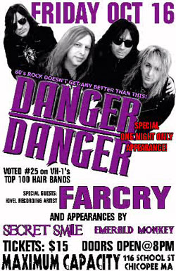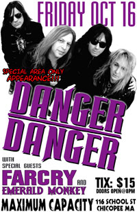 DANGER DANGER CONFIRMED FOR ROCKWEEKEND FESTIVAL IN SWEDEN: Legendary NYC-rockers Danger Danger will come to Sweden this summer and the third annual Rockweekend Festival, held in Söderhamn 2 hours north of Stockholm/Arlanda airport. The band will perform no less then two nights in a row, as guests at the Rockweekend Allstars concert on the 8th and a full show on the 9th. The bands last visit in Sweden was at the Sweden Rock Festival in 2004, and their gig was ranked by many as one of the best that year! Let's get naughty, naughty! Also confirmed for the Rockweekend Festival 2010: Deep Purple, Over the Rainbow, Paul Dianno and many more to follow... WebLink: www.rockweekend.se/2010/information/english. THE OUTFIELD RETURN IN 2010: Multi-platinum recording artist The Outfield are currently in a London recording studio recording their 7th studio album with original members John Spinks, Tony Lewis and Alan Jackman. The recording sessions have been powered by a promising surge of adrenaline and chemistry. The Outfield's explosive blend of power pop sparkle and classic rock swagger give the tracks an optimism and authenticity that is much needed in today's world. This highly anticipated release is tentatively scheduled for a summer 2010 release. WebLink: www.theoutfield.com. SLAUGHTER IN LAS VEGAS FOR NEW YEAR'S EVE: Slaughter in Las Vegas for New Year's Eve - When: December 31, 9 p.m. - Party kicks off 11 p.m. - performance by Slaughter. Midnight - Champagne toast, Rockin' into the early hours- enjoy a special post-midnight jam by Blandini. Where: Feelgoods Rock Bar & Grill 6750 West Sahara Ave. Las Vegas, NV 89146 Must be 21 or older to attend. Admission tickets are $40 per person beginning at 9 p.m. There is a seating fee for table reservations. For more information or to make table and booth reservations, please call 702-220-8849 or visit www.feelgoodsvegas.com. MR-X UPDATED: MR-X has been updated with 6 classic soundboard live shows. They are: - Aerosmith Budokan Hall Tokyo, Japan September 20,1990 - The Hooters New York City, NY Electric Ladyland Studios 1/23/1990 - The Hooters S.I.R. Studios New York 2008-03-28 - John Mellencamp Deer Creek Music Center Noblesville , IN July 4th, 1992 - Kansas Palladium New York City USA November 20 1980 - REO Speedwagon Live in Concert at the Market Street Arena, Indianapolis - 31st December, 1984 MR-X Membership Details. |