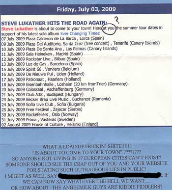 101 SOUTH SHOCKER: There are always things to deal with behind the scenes in this business, but sometimes something so utterly ridiculous comes along, that it just has to be posted for all to see. And today is one of those days. I have been a long time supporter of all things Roger Scott Craig related - Harlan Cage, Fortune and 101 South. I have featured all releases prominently over the years and became a genuine fan of his music. I first started e-mailing him in 2001 and we've been friends ever since. Until today. On July 28 of this year I once again gave prominent space to the launch of Roger's new 101 South album - being pressed as an independent release. It was being offered on his site as an autographed edition for a premium price and I promoted this offer and the website to order it from. Sadly, to this day - the CDs ordered by fans of Roger and 101 South have not been delivered. A string of excuses have been offered to folks along the way, but it was clear something was wrong when the volume of complaints reaching me increased over the last 6 weeks. I immediately contacted Roger myself and was told of delays - and a promised imminent delivery. On November 20, the album was released officially by AOR Heaven (after the label and Roger finally reached agreeable terms), with a retail price one third that of the signed version. This week I was again informed by several unhappy fans that delivery had still not occurred. Over the last 2 years Roger has become a fierce advocate for musicians rights and has been trying to implement ways to stop illegal internet downloads of music and make life fairer and easier for musicians. That is one mighty fine cause and something I also feel passionately about. It is something I have tried to be a part of myself - by promoting great music via this website and introducing new artists to old fans...and making it as easy as possible for fans to purchase this music. So I was confused and upset by the message Roger was sending out to his most loyal fans - those that jumped in at the very start to support his music and purchase the new 101 South album. The same fans that paid the premium price. I forwarded one of the complaint e-mails to Roger today with the additional message: "Totally selling your message short here Roger - please address ASAP!" Pretty reasonable request I thought and as I have previously stated to Roger over the last few months, he is damaging his "support musicians" message by holding up the delivery of these orders. Anyway...I got a very quick reply, but one that completely blew my mind. I have since sent Roger a couple of extra e-mails - the message I put back to him was pretty clear...but I'll leave that message up to your imaginations. Like I stated, I rarely do this - but here is Roger's unedited reply to my call for him to act on these CD orders: "THE BEATLES CAMP PLUS THE LARGEST UNION IN THE WORLD = MY FOCUS NOW AND SADLY 88 PEOPLE MIGHT BE UPSET BUT I WILL APOLOGIZE TO THEM THEY WILL GET REFUNDS THIS WEEK BUT MY LIFE IS NOW DEDICATED TO FUTURE GENERATION OF MUSICIANS AND I ABANDONED MY OWN CAREER TO DO SOMETHING VERY IMPORTANT SUPPORT MUSICIANS' IS GOING TO BE A VERY IMPORTANT PROJECT MUCH MORE IMPORTANT THAN ROGER SCOTT CRAIG AND STUPID 101 SOUTH 95% STOLEN MUSIC IS NOT COOL AND WHAT HAVE YOU DONE ANDREW TO ADDRESS THIS RIDICULOUS MESS?? AND DO YOU CARE ANDREW ABOUT 95% STOLEN MUSIC???? AND WHAT ARE YOU DOING???? NOTHING PROBABLY LIKE SO MANY OTHER PEOPLE!! WAKE UP PAL!!!!!!!!!!!!! DO SOMETHING, SHIT OR GET OFF THE POT!!! I LOOK TO MY FRIENDS AT THIS POINT IN TIME AND YOU HAVE DONE NOTHING SOME FRIEND OF THE MUSICAL COMMUNITY............................. BUT TWO CEOS OF THE BEATLES DO CARE AND THEY ARE DOING SOMETHING AND NOW THE AFM AS WELL WITH 100,000 MEMBERS AND WE WILL NOT SIT AROUND AND LET THIS CONTINUED THEFT OF MUSIC GO ON WE DO CARE ABOUT FUTURE GENERATIONS OF MUSICIANS!! DO YOU???????????????????????????????????????????????? And that was followed by this: "88 PEOPLE UPSET BUT MILLIONS COMING ON TO MY TEAM SOON YOU HAVE NO IDEA WHAT IS GOING ON HERE DO YOU???? JUST WATCH WHAT HAPPENS WHEN MY FRIENDS FROM THE BEATLES COME TOGETHER WITH THE LARGEST UNION IN THE WORLD 88 PEOPLE UPSET WILL NOT MATTER!!!" Well Roger...they may not matter to you…but that's 88 readers of my site that gave YOU money - and that matters to me. I expect all refunds will be given to these folk by the end of this week. You can purchase the 101 South AOR Heaven release via www.aorheaven.com and all good melodic retailers. |