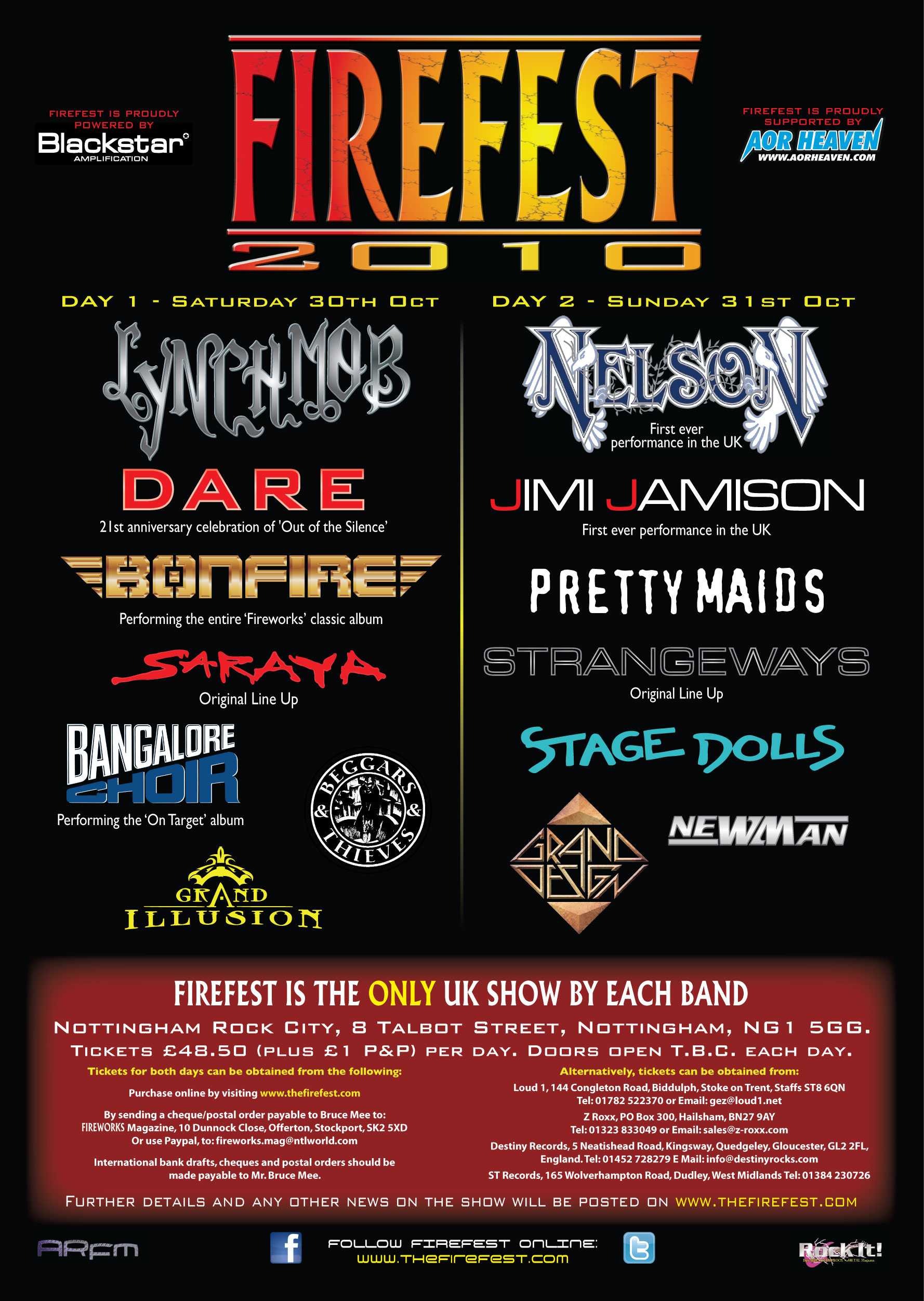 FRONTIERS RECORDS SIGNS THE LEGENDARY BAND FOR NEW ALBUM WORLD-WIDE: Frontiers Records is very proud to announce the signing of legendary rock band Whitesnake. David Coverdale and band are gearing up for their latest endeavour. Whitesnake has already started composing new material that promises to deliver one of the finest chapters in Whitesnake'S career. "We are off to a very good start, with the new songs taking positive shape. It feels good, fresh & exciting," explains Coverdale. The next release already feels like a solid, natural progression to their last opus, the successful, critically acclaimed 'Good To Be Bad' album, awarded by the influential Classic Rock magazine as "Best Album of the Year" in 2008. "As always, we want to take it to the next level," states' Coverdale. "I feel that with the last album we achieved a strong Whitesnake 'cocktail' that comfortably embraced & mixed all the previous musical aspects & styles of the band's history, while taking our identity a little further... all on one album..." Born in 1977, Whitesnake have been among the most influential representatives of the their genre, having produced numerous rock music classics such as 'Here I Go Again', 'Is This Love', 'Still Of The Night', 'Fool For Your Loving', 'Ain't No Love In The Heart Of The City' or 'Walking In The Shadows Of The Blues'. Coverdale said the production team for the new album will most likely be the infamous Brutal Brothers, or Los Bros Brutalos, who handled the recording of "Good To Be Bad". "The new songs are in the very familiar and recognizable Whitesnake territory of soulful, bluesy, melodic power rock, with a couple of ballads thrown in for good measure... It can't be a Whitesnake album without ballads, mate!" Whitesnake have conquered the love and respect of the audiences all over the world with their driving shows and music. The new album promises to follow in the steps of a great heritage of solid and timeless songs. For more information, please visit www.whitesnake.com and www.frontiers.it. ![]() FIREFEST 2010 – PRESS RELEASE: Firefest UK Press Release / "For our 2010 show we've decided to go for two full days, with a slightly later start time and just seven quality bands per day. We think we've put together a bill that should please many devotees of melodic hard rock and have arranged several special sets to celebrate well-loved albums and anniversaries. Several acts will be making their first appearances on UK soil whilst others have been much missed and will be returning after many years away. Here are the details…" Venue and dates - Firefest will take place on Saturday 30th and Sunday 31st October 2010 at our regular venue of Rock City in Nottingham. Line-up Saturday October 30 (Top to bottom) Lynch Mob It's been twenty years since ex-Dokken guitar virtuoso George Lynch last graced a UK stage. During that time he's explored new directions and in 2009 came full circle when he re-united with original Lynch Mob singer Oni Logan to deliver the excellent 'Smoke & Mirrors' album. The band have had great reviews since they hit the road last year so expect an explosive set taken mostly from their latest opus and their classic 'Wicked Sensation' debut. Dare The UK melodic rockers led by Darren Wharton last graced a Firefest back in 2005 at our inaugural show and have yet to play a UK date since original guitarist Vinny Burns rejoined two years ago. Twenty-one years have passed since their classic 'Out Of The Silence' debut was released so it's a great honour for us to have the band base their set around that popular record. Bonfire The enduring German hard rockers have been around in one guise or another since the late 70's but really started to make waves on both sides of the Atlantic with their classic 1987 album 'Fireworks'. With a very special set to celebrate the album that gave Firefest's sister magazine it's name, Claus Lessmann, Hans Ziller and co. will play the 'Fireworks' record in its entirety. Saraya Continuing Firefest's proud record of providing the unexpected, the US rock band led by Sandi Saraya and Tony 'Bruno' Rey are back after an eighteen year hiatus. Keyboard player Gregg Munier tragically passed away in 2006 but all other original members will be present to play a set based around their melodic debut album, with a smattering of their harder edged 'When The Blackbird Sings' album for good measure. Bangalore Choir Another cult US hard rock band will grace our stage in the shape of Bangalore Choir. Their 1992 debut album 'On Target' is well-respected for its sublime mixture of melody and crunch, and led by ex-Accept singer David Reece and guitarist Curtis Mitchell the band will play the whole record. It'll be their first ever show in the UK and we're sure they'll be made very welcome. Beggars & Thieves Two years ago singer Louie Merlino and guitarist Ron Mancuso played a short acoustic set at the Friday night meet & greet for Firefest V, so we're delighted to welcome them back with a full band. They're currently in the studio recording a new album so will have some new songs to play alongside the highlights from their first three records. Grand Illusion After a break of four and a half years Sweden's Grand Illusion have decided to give it another go. The original trio of Anders Rydholm, Peter Sundell and Per Svensson are currently recording a new album with some pretty high profile guests and with three strong releases already under their belts they have a wealth of upbeat melodic rock songs to get the party off to a good start. Sunday October 31 (Top to bottom) Nelson Twins Matthew and Gunnar Nelson caused a stir in 1990 when their first single '(Can't Live Without Your) Love And Affection' reached the top of the US charts. They would go on to create several high quality albums throughout the 90's and are applying the finishing touches to a new release called 'Lightning Strikes Twice' as we speak. Despite their rich heritage this will be their first ever UK 