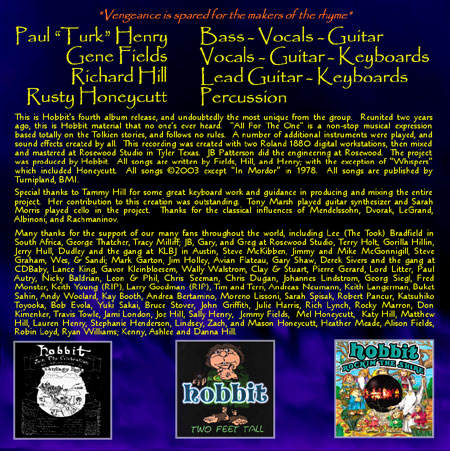 Hobbit began some years ago (1st Age) when 'Turk' (Bass/Vocals) and Gene (Vocals/R.Guitar) sparked a vision to make music. The combination of similar rock-n-roll influences, and the powerful attraction (and living in) to J.R.R. Tolkiens's Middle Earth, opened the way to a style everyone called "Fantasy Rock"?!